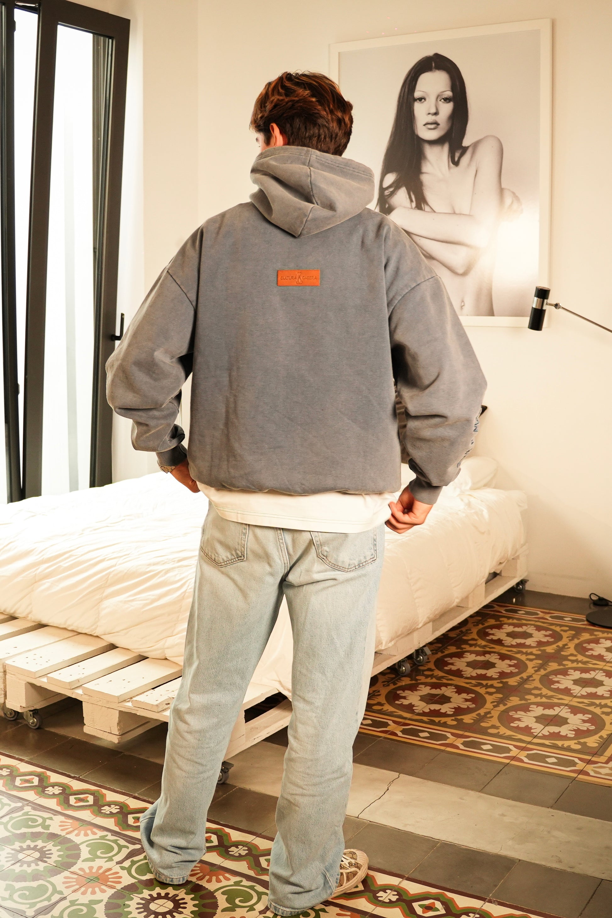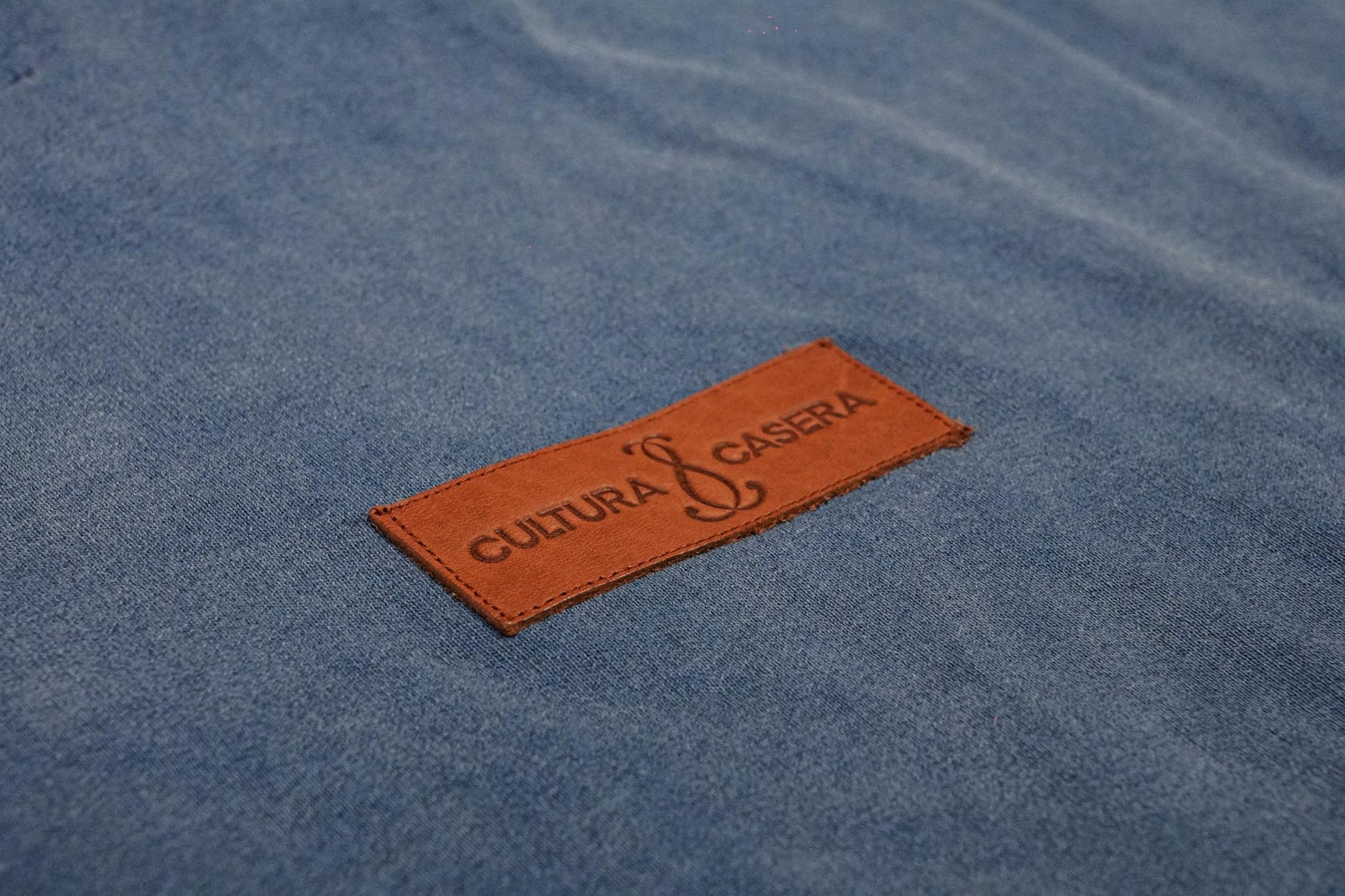 Pieza de piel 100% natural. Cosida a la espalda, justo debajo de la capucha, con el mítico lema de “Cultura casera” impreso en ella.